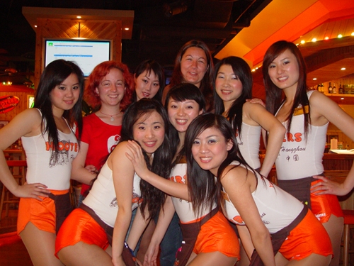 this most awesome of photos was snapped in hooters (yes, the very same) in hangzhou, china before it, sadly, went the way of the dodo bird. there are, in fact, 4 hooters locations in china which make great spots for happy hour specials and hot wings cravings. stacy (left) and i just couldn’t resist getting this photo with the hangzhou hooters girls – a surreal sight indeed.