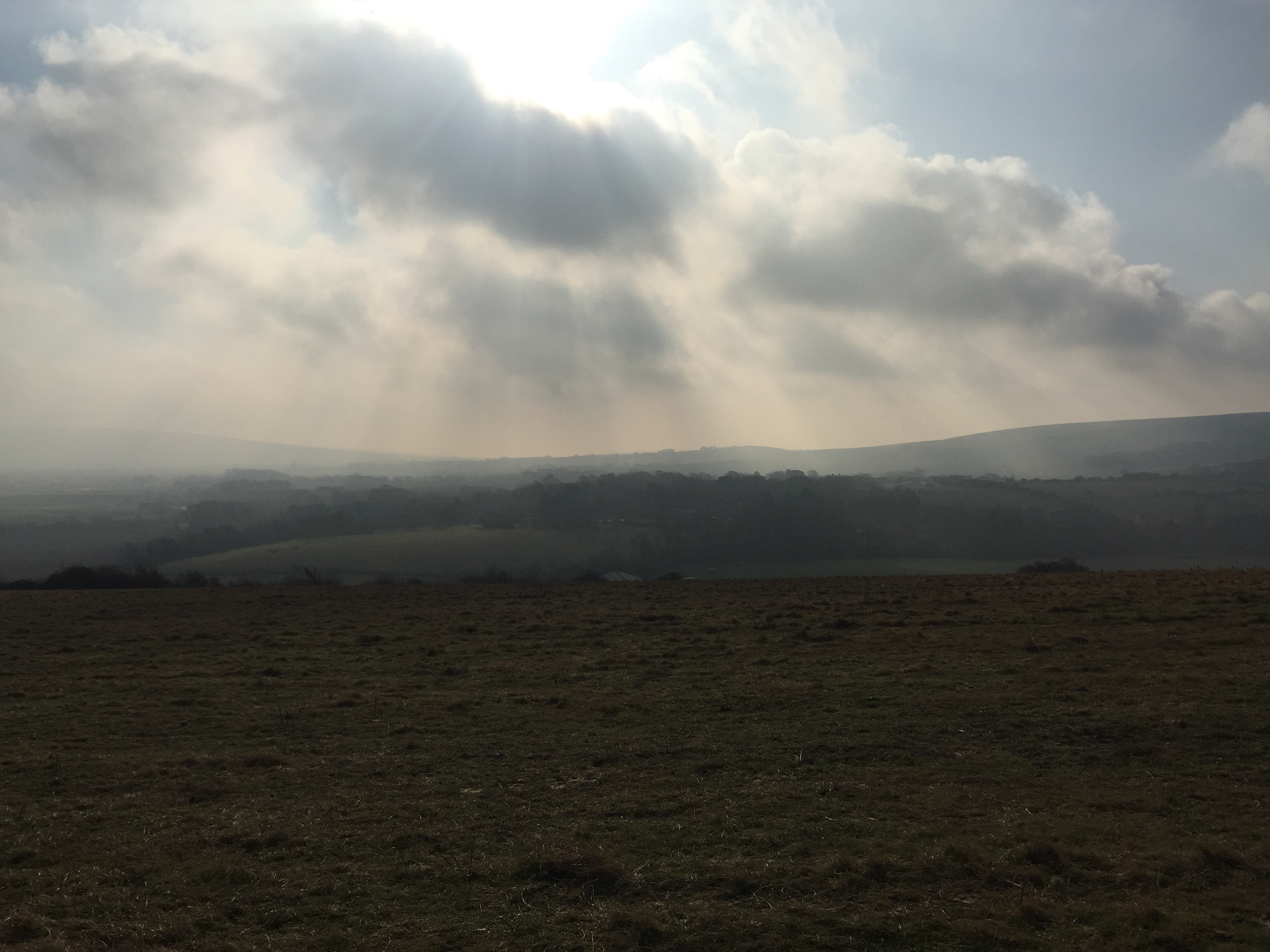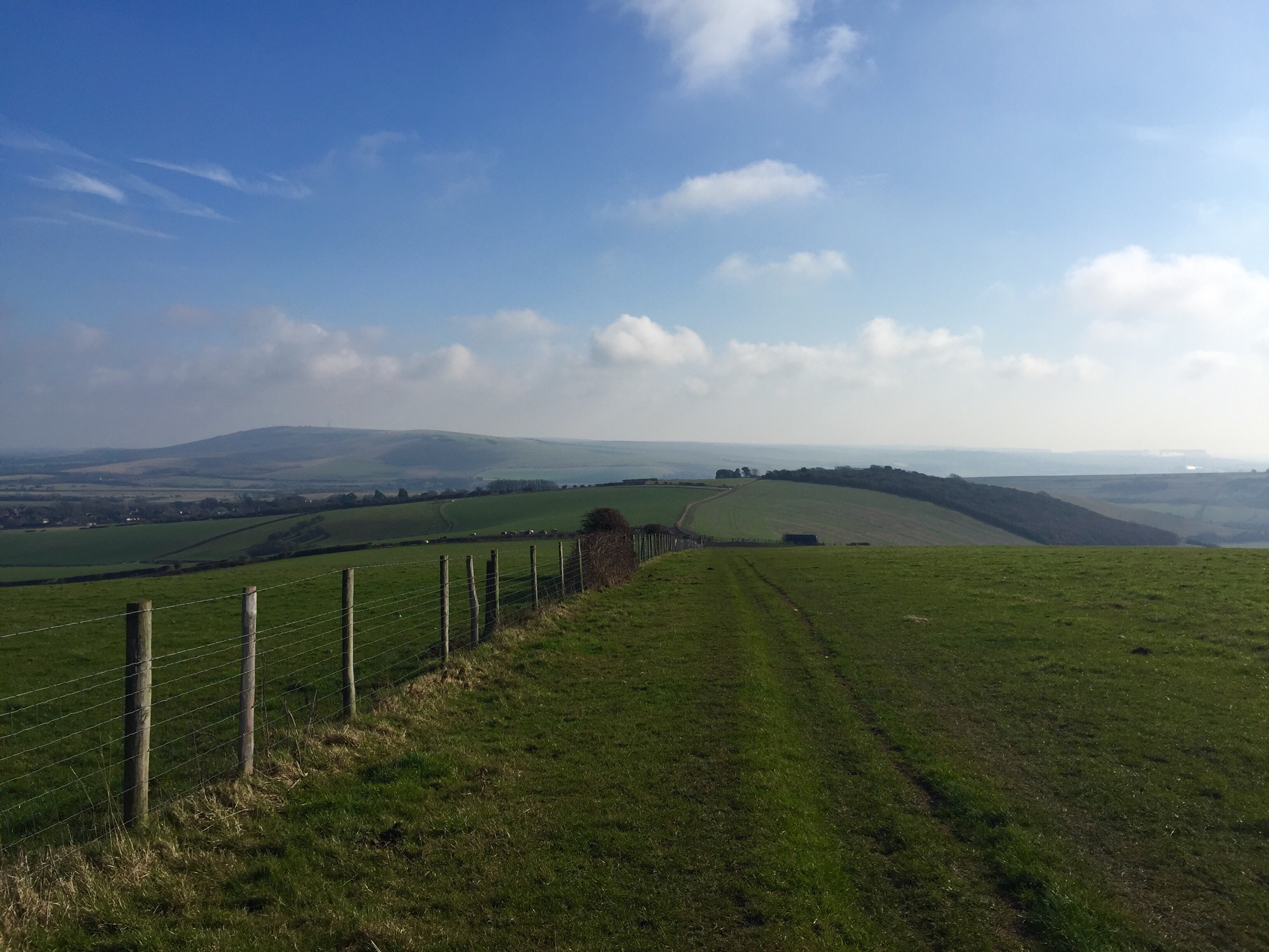 the path splits and you veer left, scampering up a jagged car-wide track to the top of the escarpment, where you join the south downs way. and then you are above everything, on a bare ridge, with views of white chalk cliffs to the north and undulating green to the south. forecasted clouds began to burn off, a warming winter sun appeared in front of me and soon i had stripped off all but the thinnest of layers.