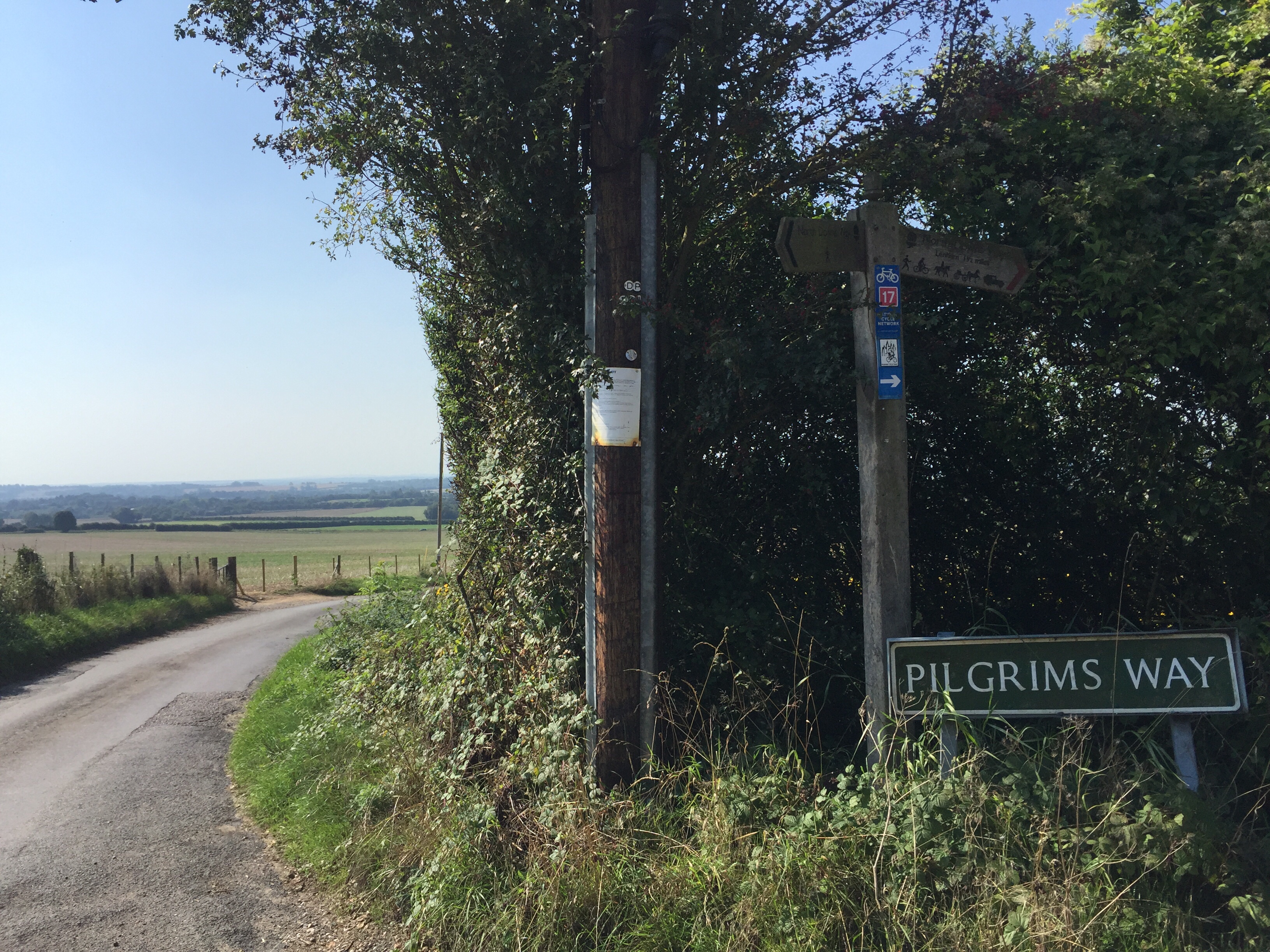 the day wears on, the trail winds between the tunnelling green of holloways and out on chalk downs with views to yellowed hayfields already harvested and gone stalky for the autumn. i take my lunch on a bench at the lenham war memorial below a giant white cross carved into the hill.