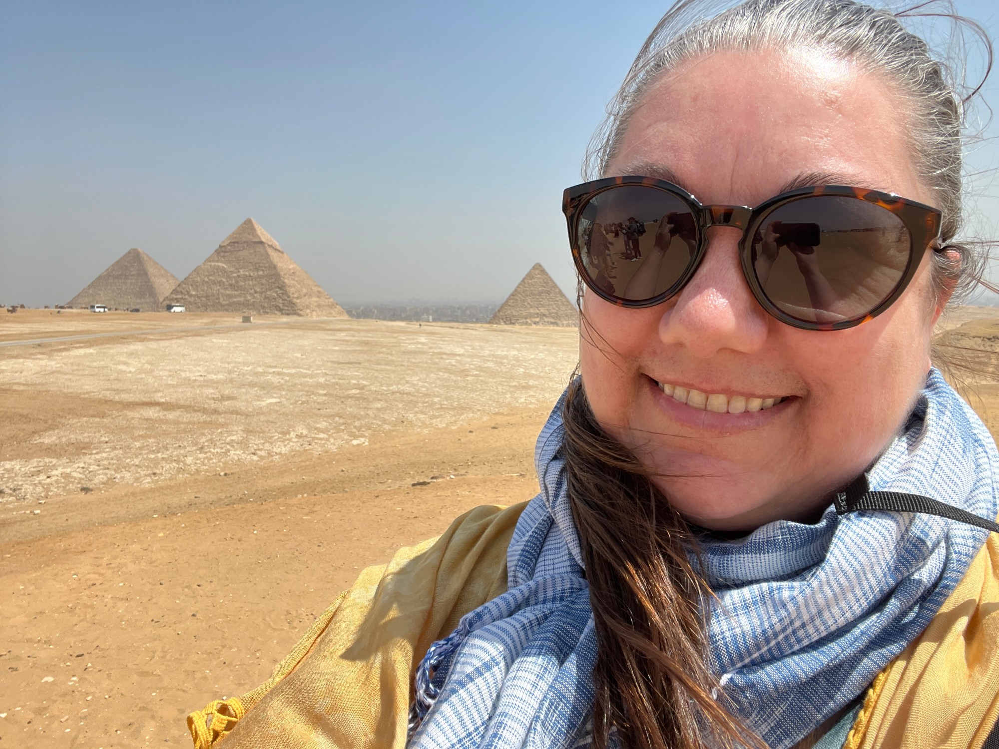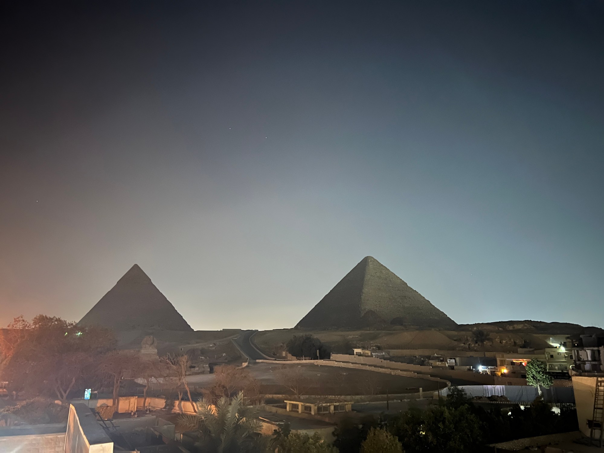 Arriving at 1am, I threw open the blackout curtains in the small, tiled-floor room and stepped onto the balcony. There were the Pyramids, looking like some trick of CG, standing tall – ghostly triangular outlines against a black desert sky, lit by the sickly orange glow of Cairo’s light pollution.