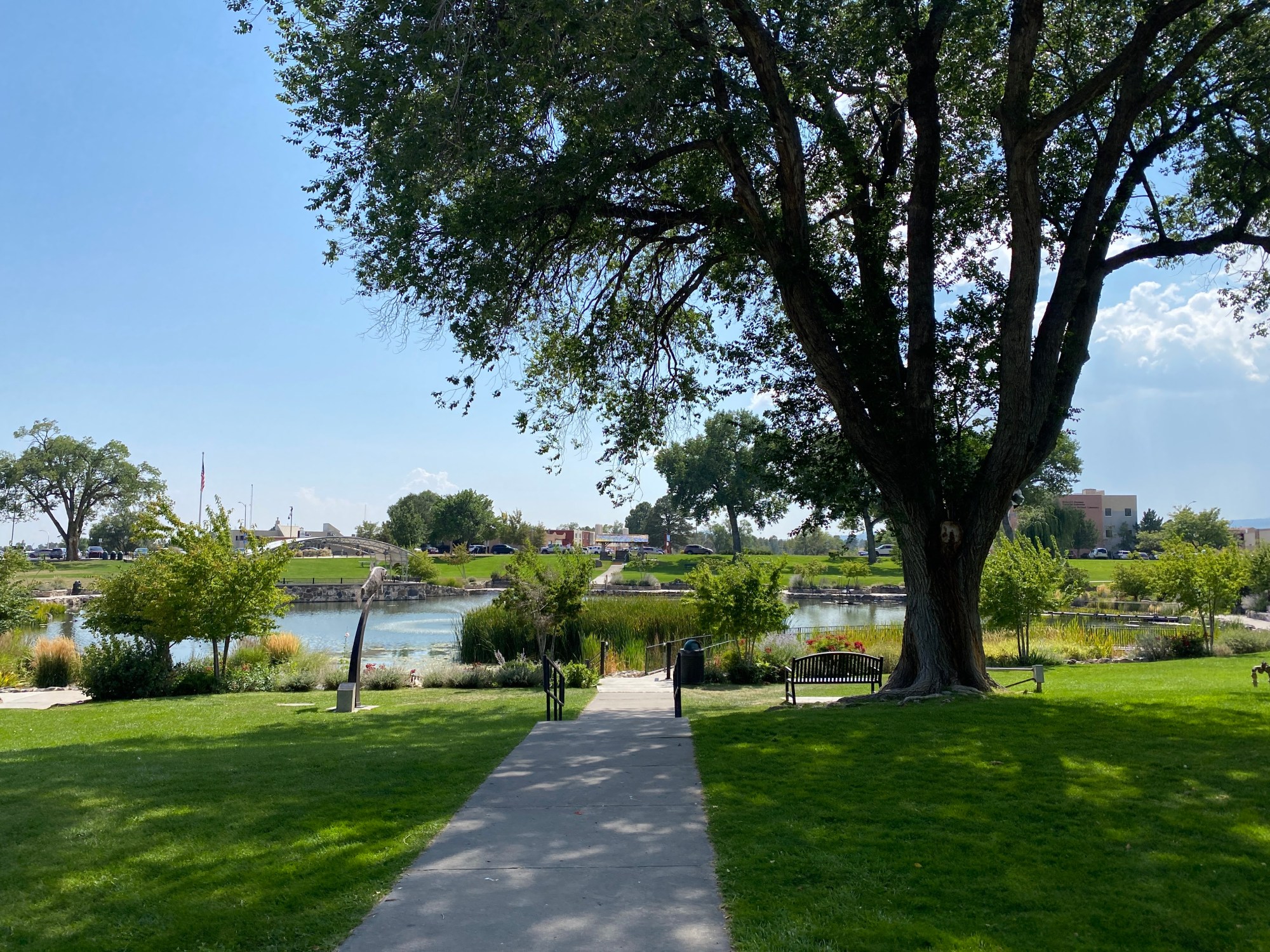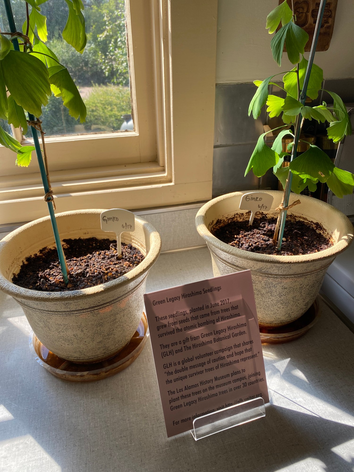 The museum’s main exhibit recounts the history of Oppenheimer and the bomb’s development and then funnels you into a room with seats and a 3-walled screen that shows a loop film of deeply moving interviews with Japanese survivors of Hiroshima and Nagasaki. You then walk around the grounds and can enter several of the ‘Bathtub Row’ houses, including the Hans Bethe House. On the windowsill here in soft sunshine, I admired two seedlings of survivor Ginkgo trees from Hiroshima gifted to Los Alamos, which will be planted in due course (and maybe already have been).