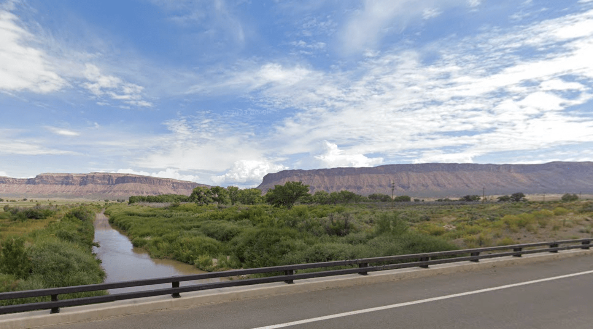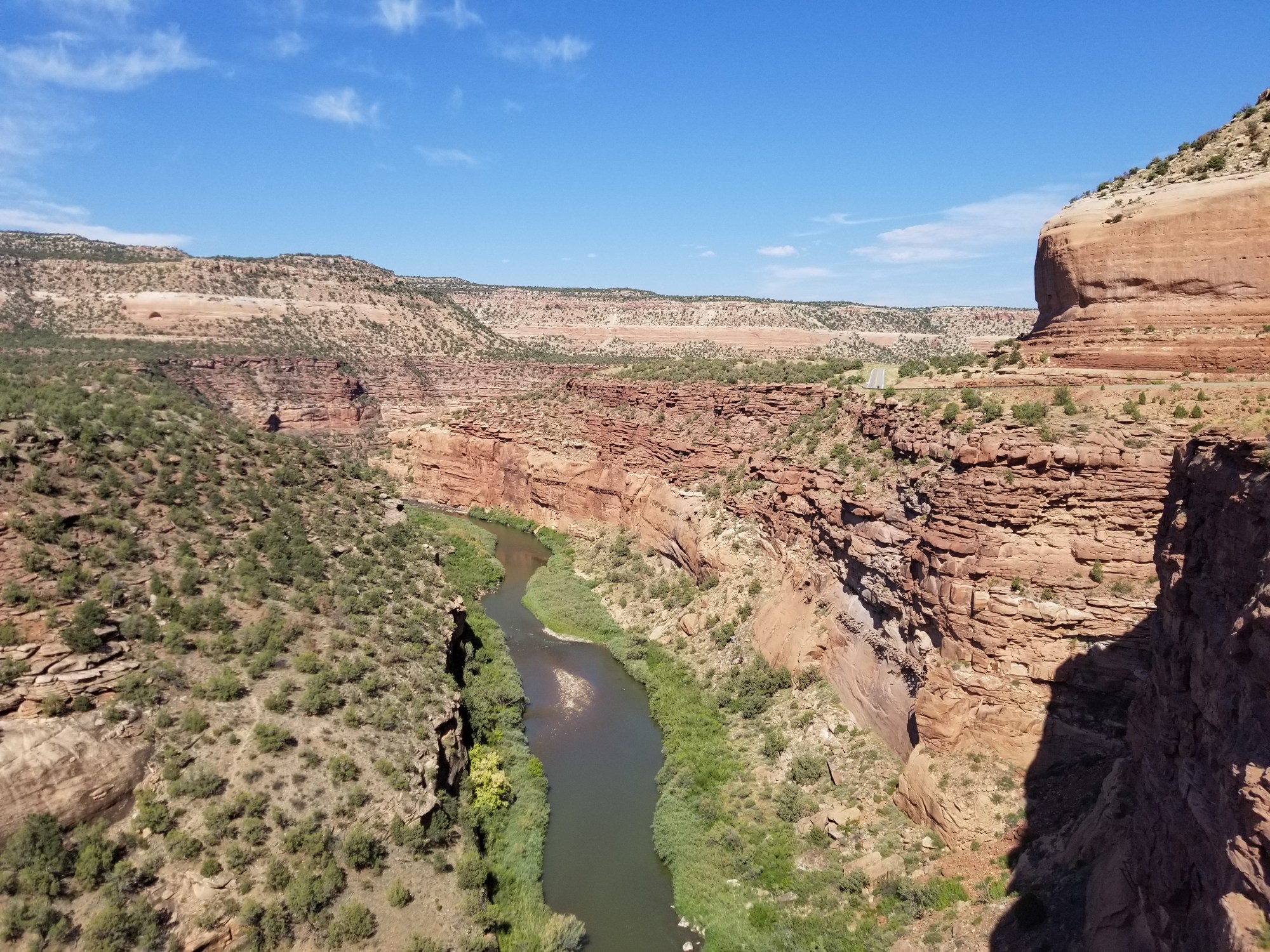 Partway along, the mesa is cut in half by a river flowing perpendicular to the valley. This is the Dolores River, a tributary of the mighty Colorado River, which carves the Grand Canyon. The Dolores cuts a trail of its own canyons as it meanders from its source in the Rockies down and back up to the Colorado near Dewey, Utah, north of Moab.