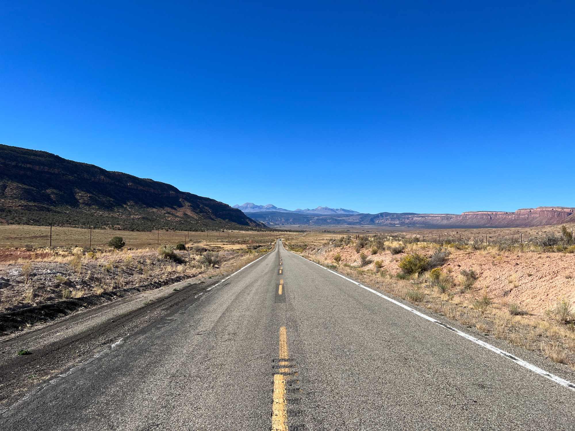 I came out of Moab in a rented, black Nissan Sentra bound for the Rocky Mountains. I headed south out of town and passed Moab Rim Arch and the Hole ‘N’ The Rock – the last vestiges of the red, desert-solitaire landscapes of that place before cutting east on Utah state highway 46. The road was empty all the way up to La Sal, a one-horse village named by Spanish colonists who thought the snow-dusted mountains looked covered in salt. In La Sal, a general store and a US post office stand side-by-side in red brick overseen by a flagpole flying the stars and stripes along with the black POW/MIA flag. Later on, 46 drops down into a valley following La Sal Creek, curving closely alongside the stream, which was lined at this time of year with golden cottonwood trees with their thick, gnarled trunks spreading down to the water line in search of autumn hydration.