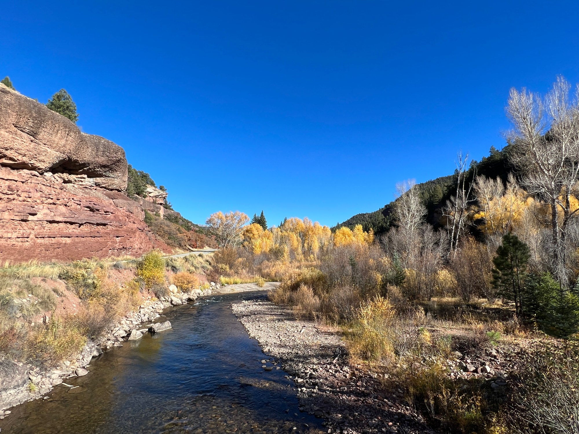 When I reached the state line, I got out at the ‘Welcome to Colorful Colorado’ sign and snapped a picture, then stood on a small bridge and watched the creek bubble by. Only a few cars passed and all else I heard was the fluttering of cottonwood leaves, which also sounded like rushing water.